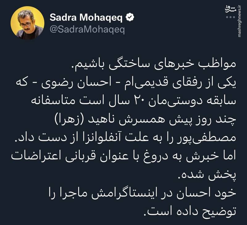 یک روزنامه نگار اصلاح طلب در صفحه شخصی توییتر خود در خصوص این خبر نوشت: مواظب خبرهای ساختگی باشیم. یکی از رفقای قدیمیام – احسان رضوی – که سابقه دوستیمان ۲۰ سال است متاسفانه چند روز پیش همسرش ناهید (زهرا) مصطفیپور را به علت آنفلوانزا از دست داد.