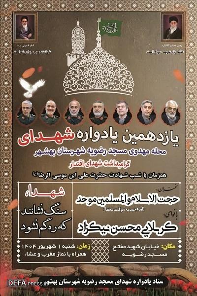 به گزارش مجاهدت از خبرنگار دفاعپرس از مازندران، همزمان شب شهادت امام رضا (ع) یازدهمین یادواره شهدای محله مهدوی مسجد رضویه شهرستان بهشهر و گرامیداشت شهدای اقتدار شنبه یکم شهریور همراه با نماز مغرب و عشاء برگزار خواهد شد.