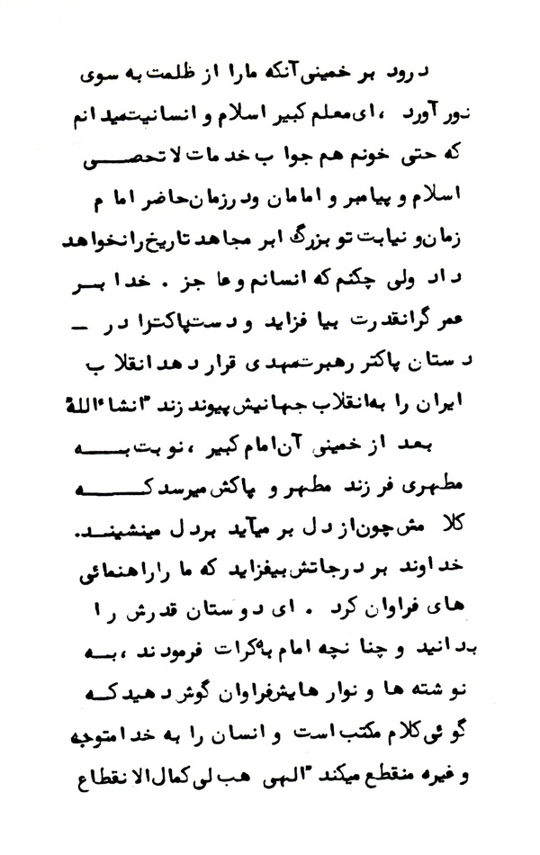 من خاضعانه و ملتمسانه از مردم و مسئولان میخواهم که برای عزت و سربلندی ایران متحد باشند. دشمن همیشه از تفرقه سوءاستفاده میکند. جوانان با مطالعه روایتهای دفاع مقدس، راه و منش شهدا را الگوی خود قرار دهند. این شهدا برای حفظ عزت ایران جان دادند و ما وظیفه داریم یادشان را زنده نگه داریم و برای سربلندی کشور تلاش کنیم.